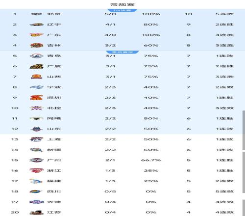 目前,只有北京队、广东队保持全胜战绩,辽宁队已经输过一次,另外四川队、天津队、江苏队都是开局全败,卫冕冠军广厦队四轮3胜1负,暂时排名第六位。